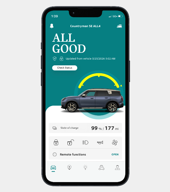*The MINI App is compatible for MINI vehicles from 2019 model year and newer in conjunction with the option ConnectedDrive Services and a compatible smartphone. Available apps and services are subject to change, may vary by location or other factors. May require additional services, plans, subscriptions and vehicle options, and may only be operable in conjunction with certain smartphones and operating systems (smartphone not provided). Not all apps or services may be available for all MINI models.
