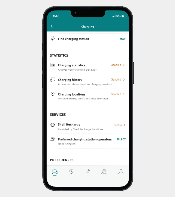 Step 2: Go to Shell Recharge. On the vehicle status page, scroll to the “Charging” section, then click on “View all." Once in the Charging menu, scroll down to “Services” and click on “Shell Recharge.”